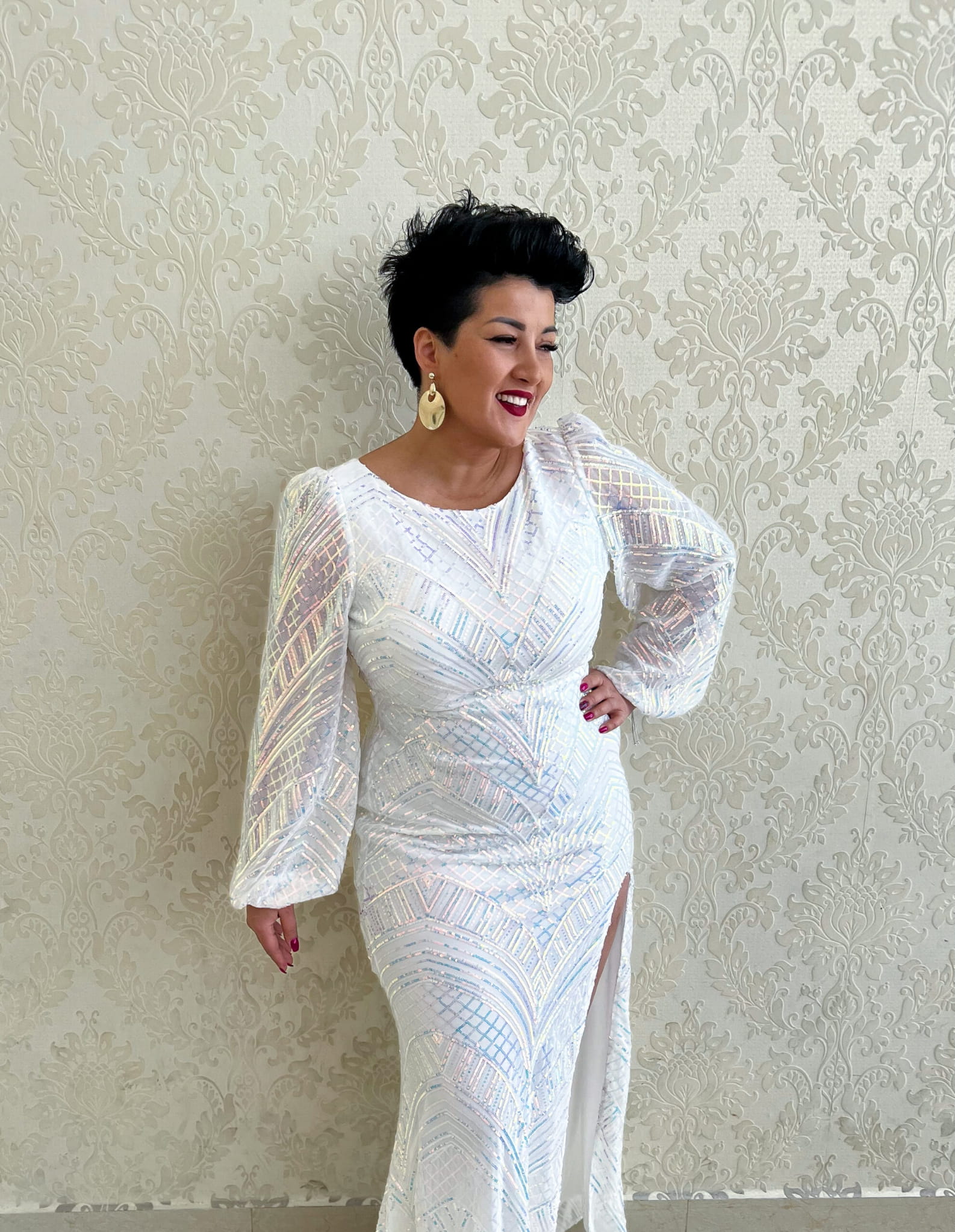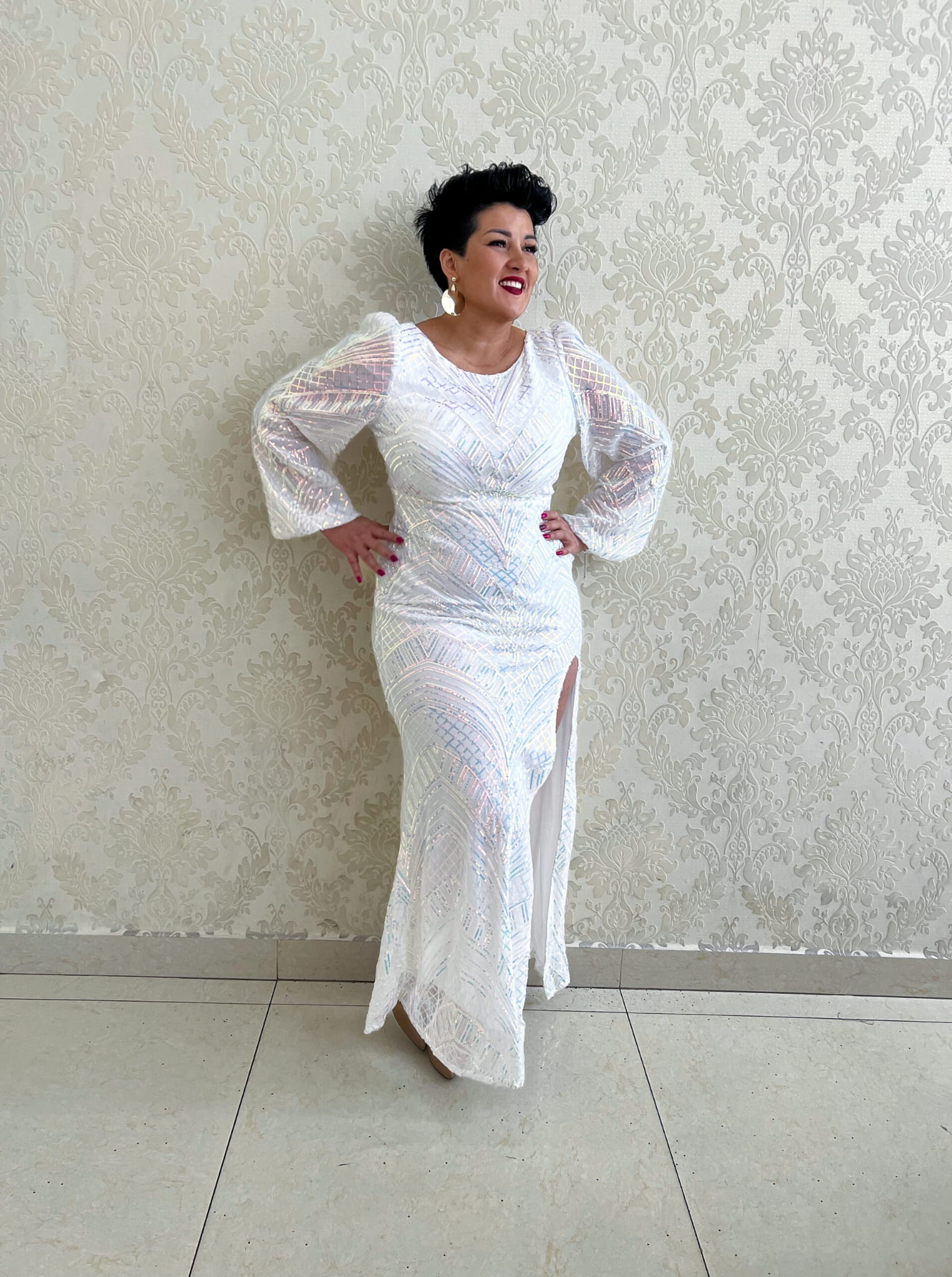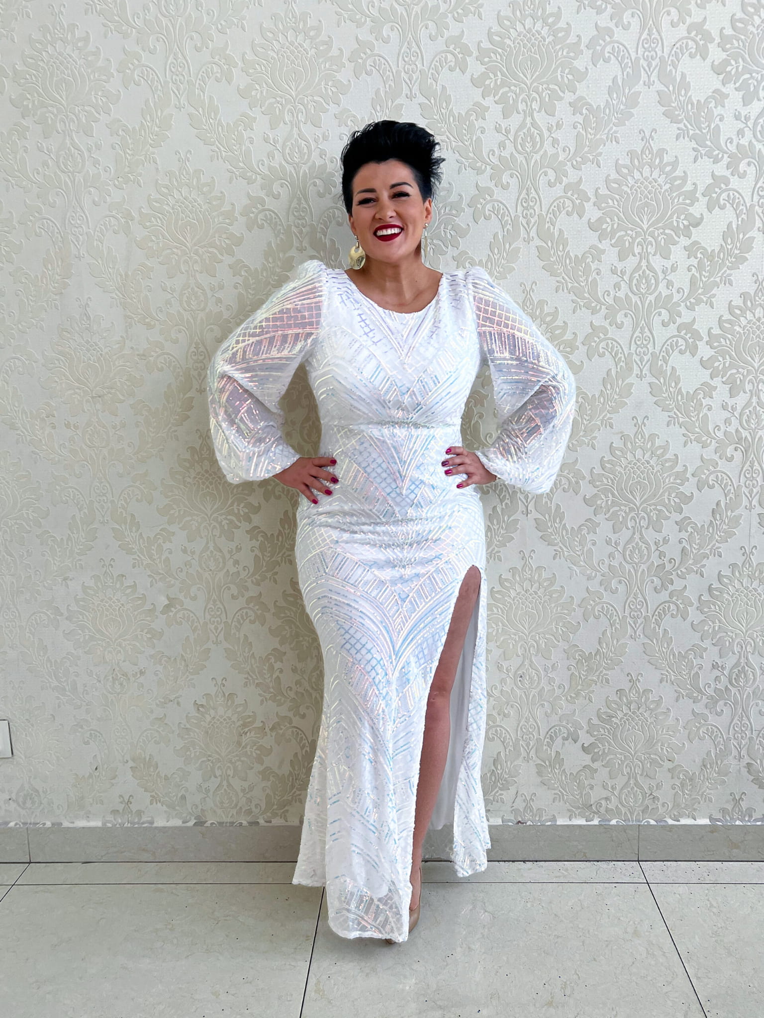 Długa, cekinowa, mieniąca się sukienka.
