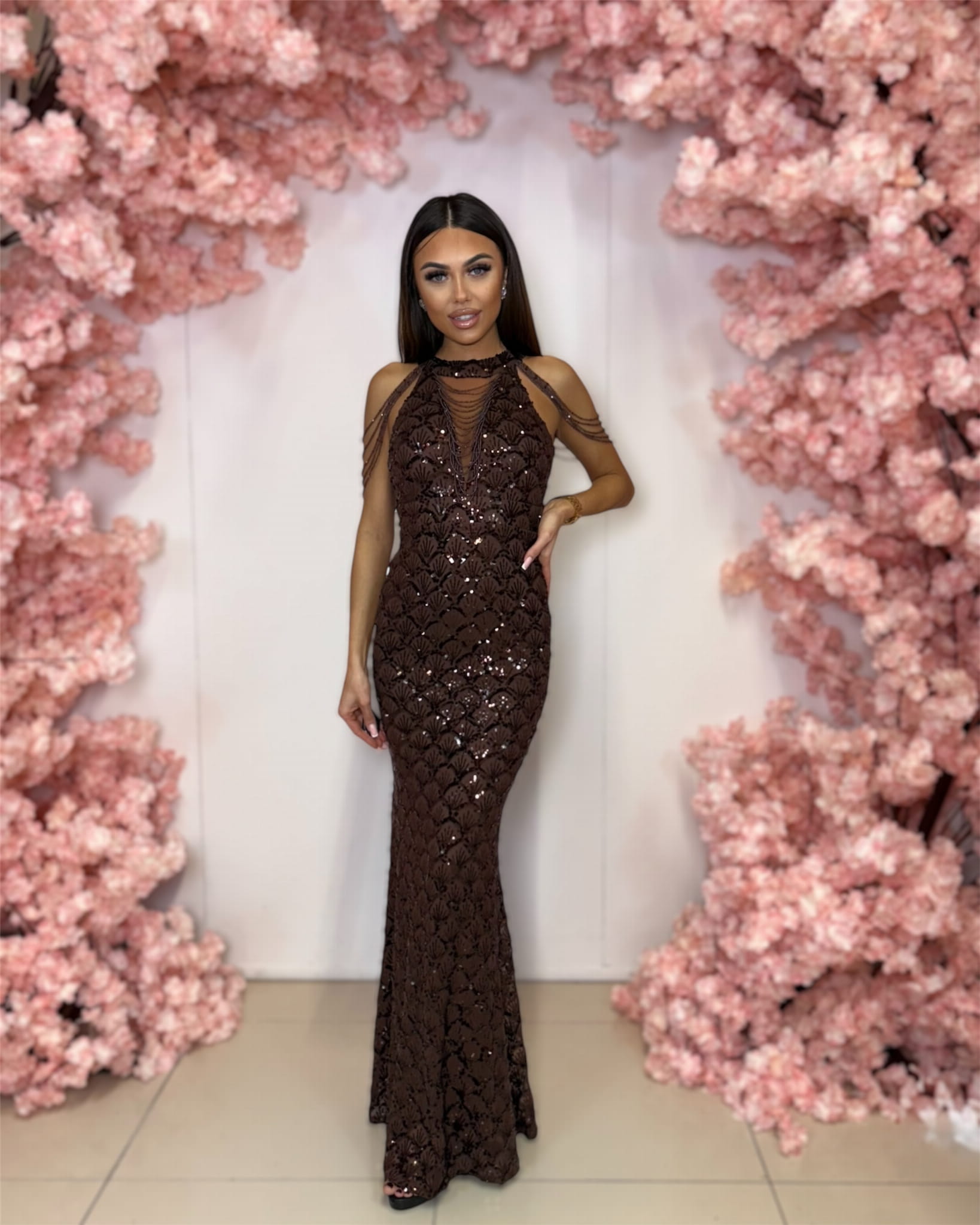 CZEKOLADOWA DOPASOWANA SUKIENKA MAXI CEKINY NOLA