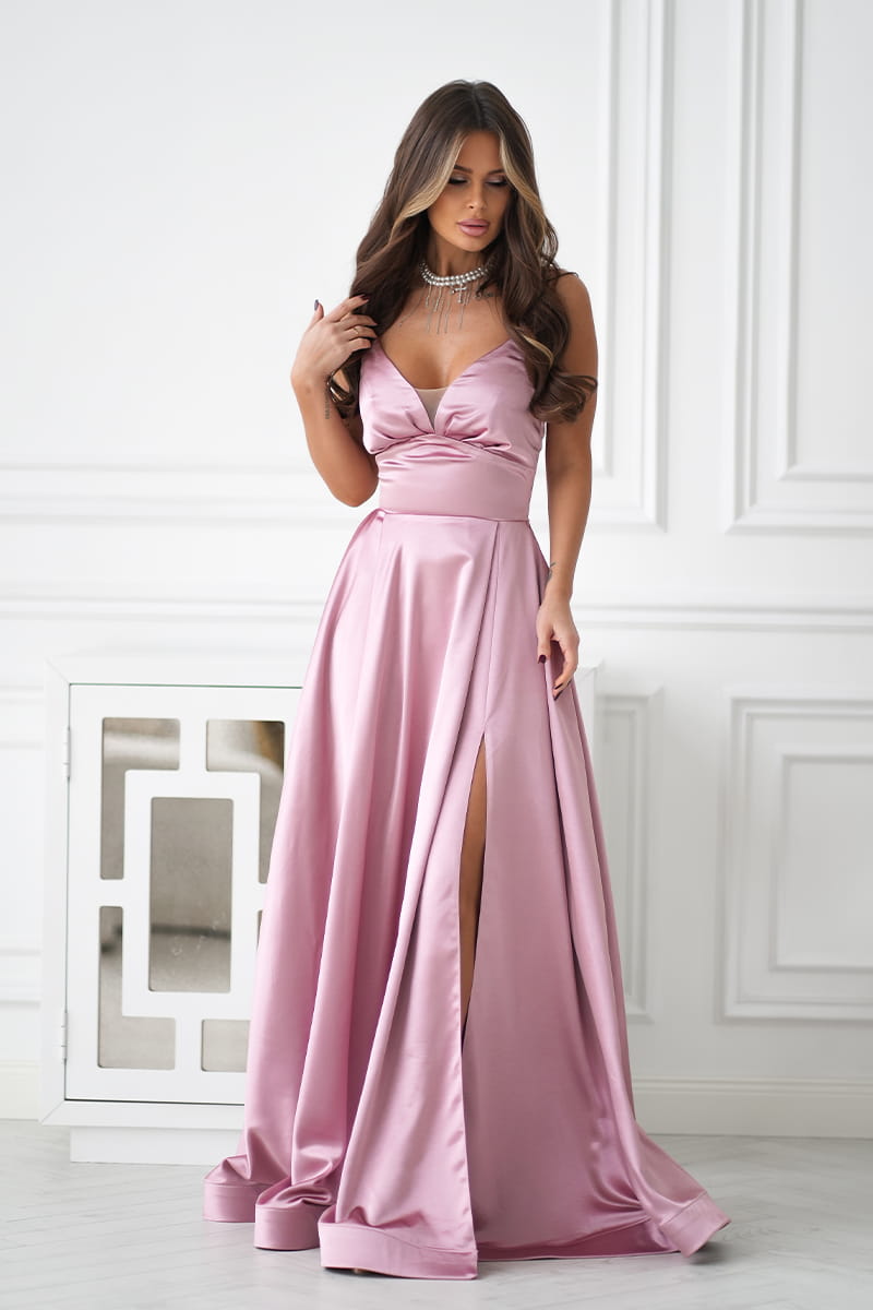 Sukienka o balowym charakterze, wykonana z połyskującej satyny.