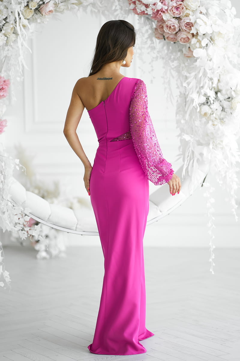 Model z pięknym cekinowym rękawem na jedno ramię.