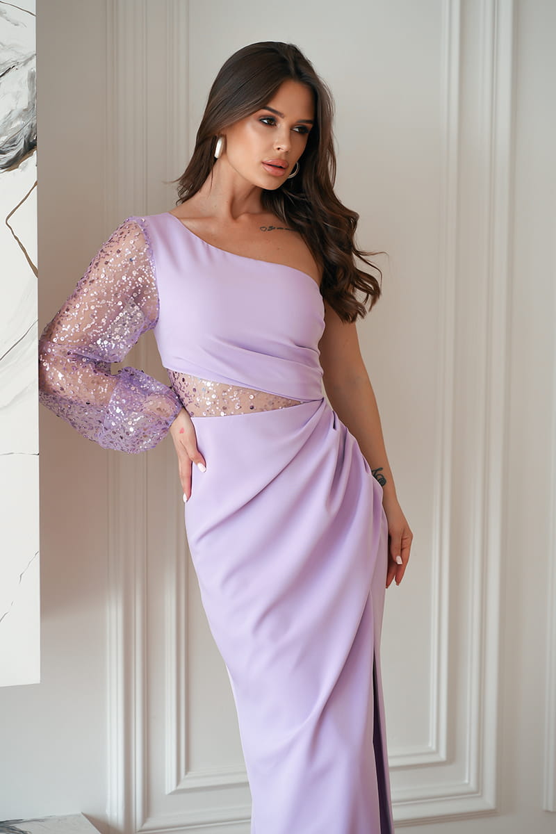 Model z pięknym cekinowym rękawem na jedno ramię.