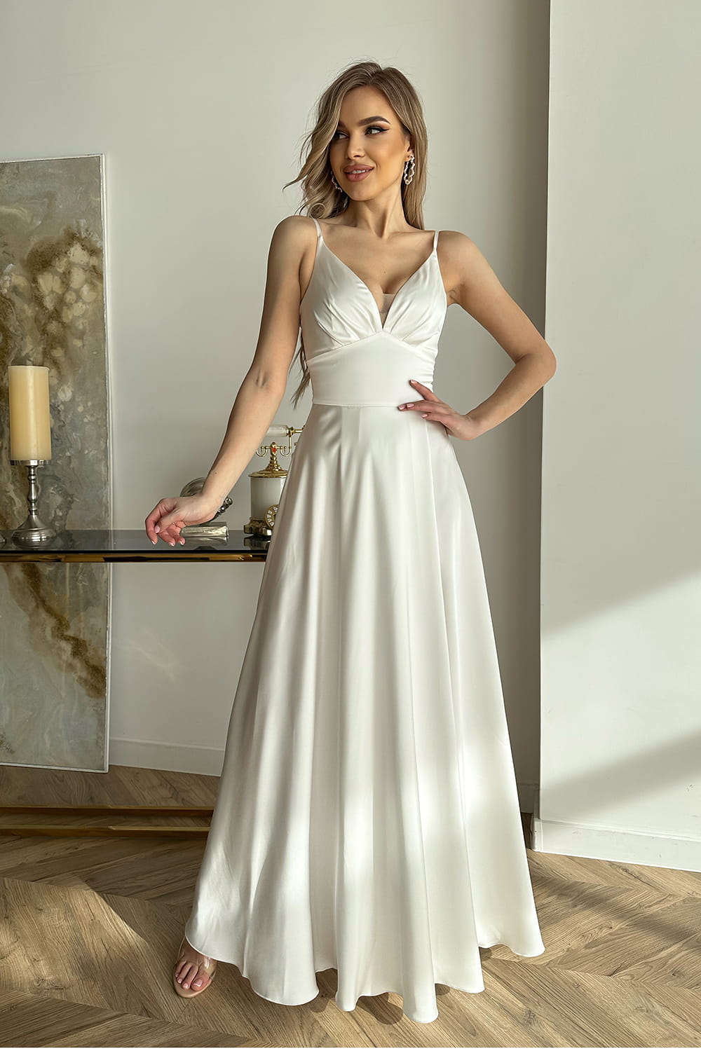 Piękna satynowa kreacja połączona z wyciętą góra na cieniutkich ramiączkach.